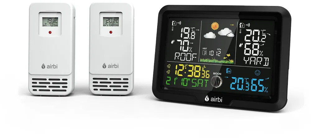 Az Airbi DUO Color időjárásállomás egy olyan intelligens otthoni eszköz, amely egyszerre több helyen is részletes áttekintést nyújt az időjárásról, a páratartalomról és a hőmérsékletről. A két vezeték nélküli érzékelőnek és az egyes érzékelők adatait jól láthatóan megjelenítő színes kijelzőnek köszönhetően az állomás tökéletes eszközzé válik az otthoni, kerti, gyerekszobai vagy fürdőszobai klímafigyeléshez. Minden érzékelőhöz saját név rendelhető, ami nagyban megkönnyíti a megjelenített adatok közötti tájékozódást. A színes kijelző világosan megjeleníti a hőmérsékletet, a páratartalmat, a holdfázist, az aktuális időt és a dátumot, amelyet DCF rádiójel vezérel. Az Airbi DUO Color időjárásmérő állomás a min. és max. értékek, légnyomásmérés és időjárás-előrejelzés hat szimbólum segítségével. A hálózati és akkumulátoros tápellátásnak köszönhetően használata a lehető legrugalmasabb. A praktikus kényelmi smiley funkció megmondja, hogy kellemes-e a környezet az otthonodban.